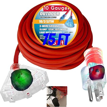 10 3 Heavy Duty Extension Cord 75 Ft 10 Gauge Extension Cords Rated Up To 1875 Watts 125v 15amp 3 Outlet Lighted Sjtw Indoor Outdoor 10 Gauge Grounded Cord 10 Awg Triple Outlet Extension Cord 75 Ft Amazon Com